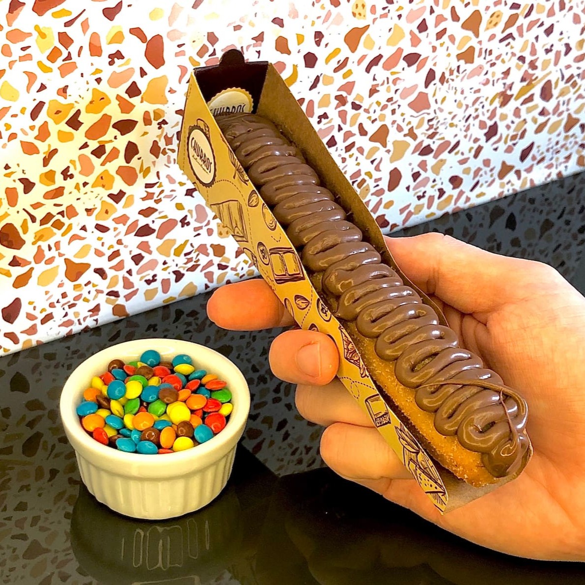 Churros tradicional deitado, com recheio de chocolate e cobertura de Nutella pura. Aproximadamente 16cm - serve 1 pessoa.