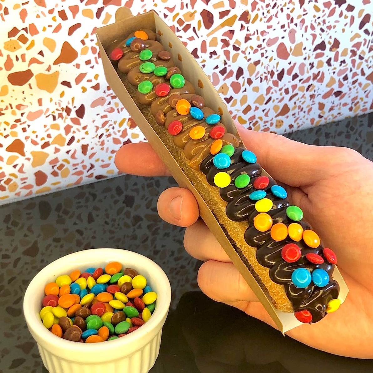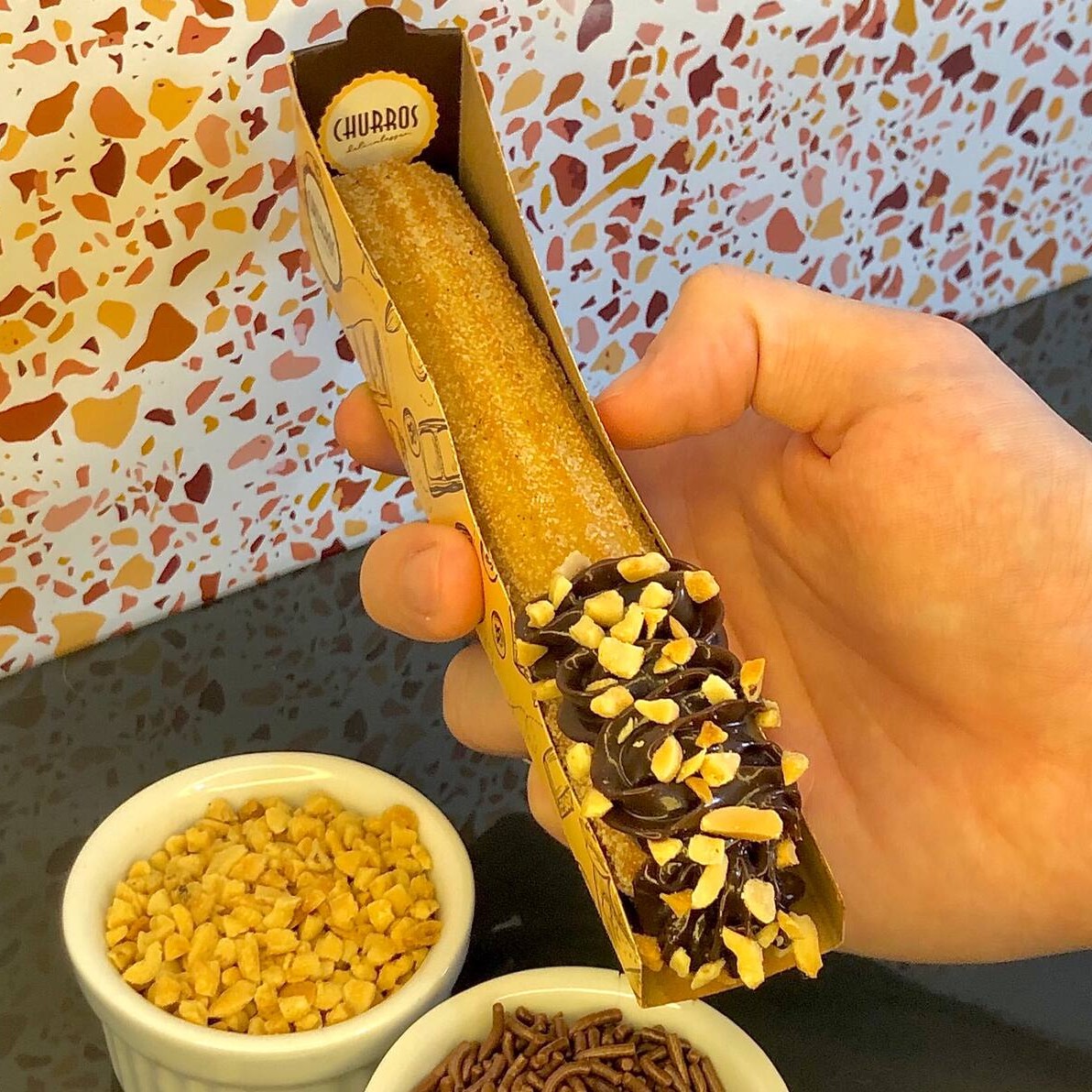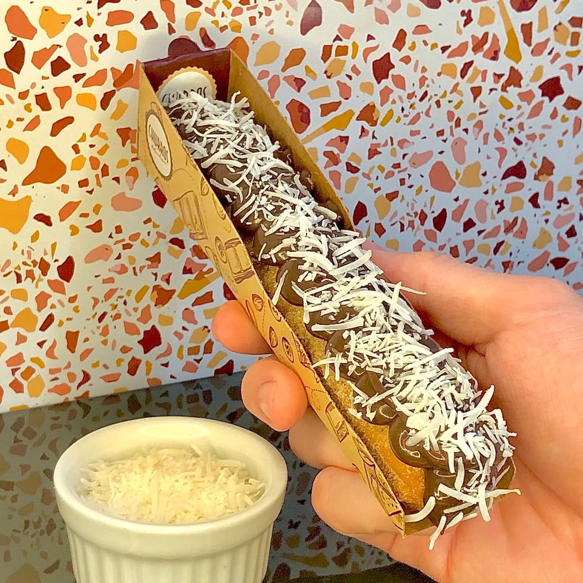 Churros tradicional deitado, com cobertura cremosa e sabor intenso de chocolate 50%. Aproximadamente 16cm - serve 1 pessoa!