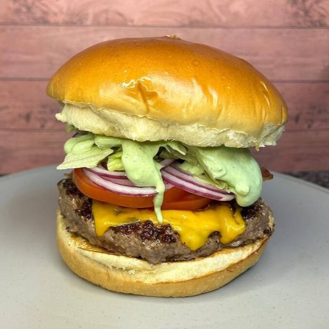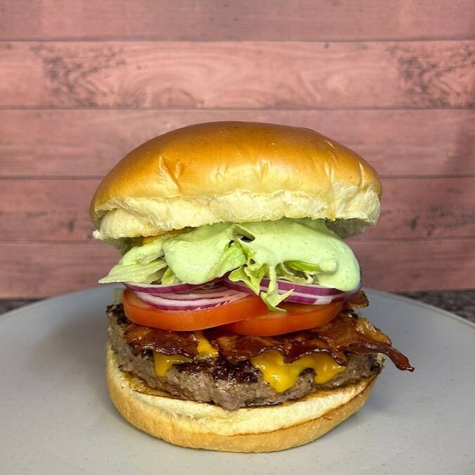 Delicioso pão brioche selado, suculento hamburguer artesanal angus (150gr), queijo cheddar derretido, bacon, alface, tomate, cebola roxa e deliciosa maio verde.