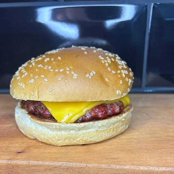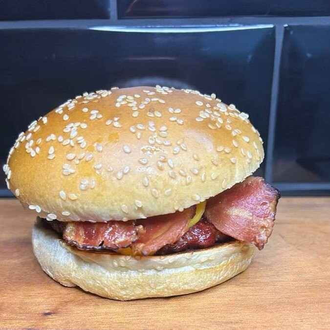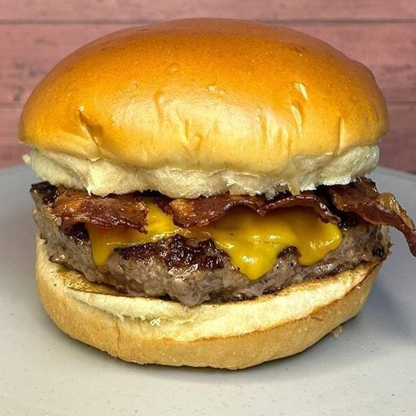 Delicioso pão brioche selado, suculento hamburguer artesanal angus (150gr), queijo cheddar derretido e bacon crocante.