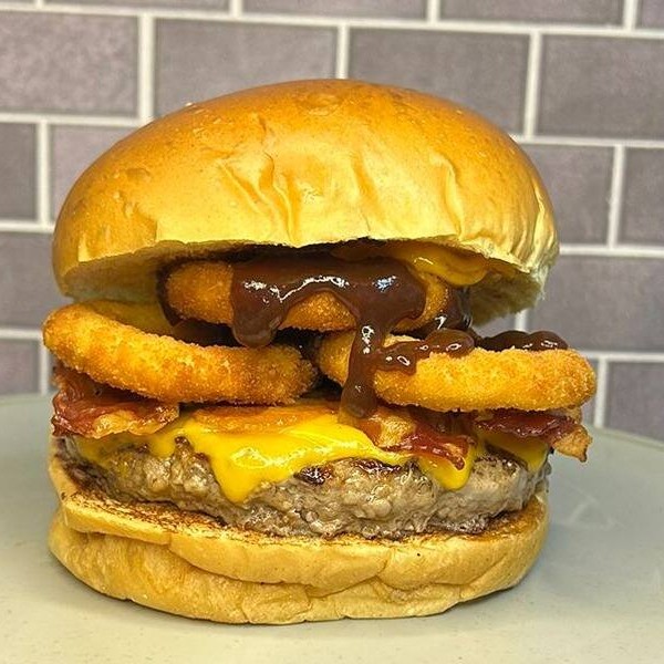 Delicioso pão brioche selado, suculento hamburguer artesanal angus (150gr), queijo cheddar derretido, deliciosos anéis de cebola crocante, bacon e barbecue