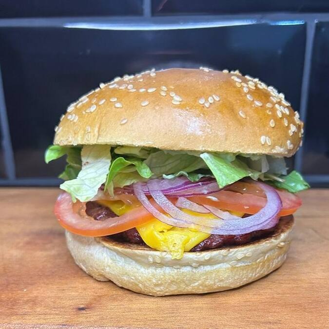 Delicioso pão brioche selado, suculento hamburguer artesanal angus (150gr), queijo cheddar derretido, alface, tomate, cebola roxa e deliciosa maio verde