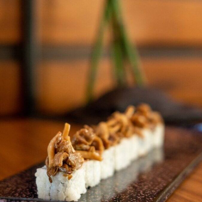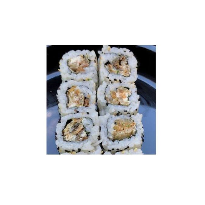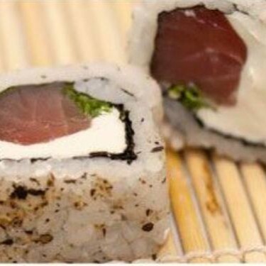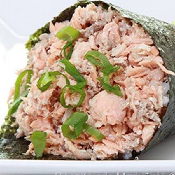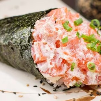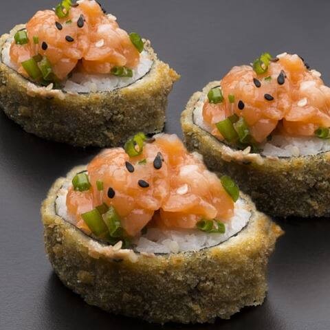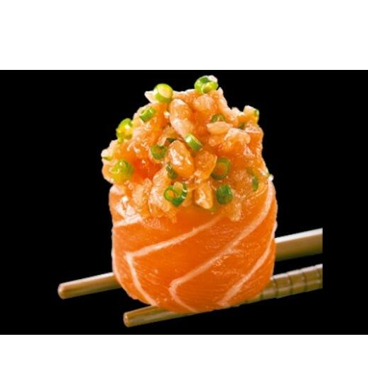 Salmão em cubos, shimeji refogado, cream cheese, cebolinha e molho tarê.