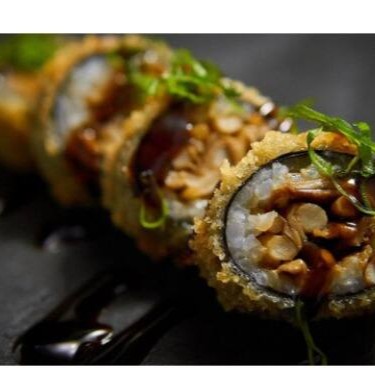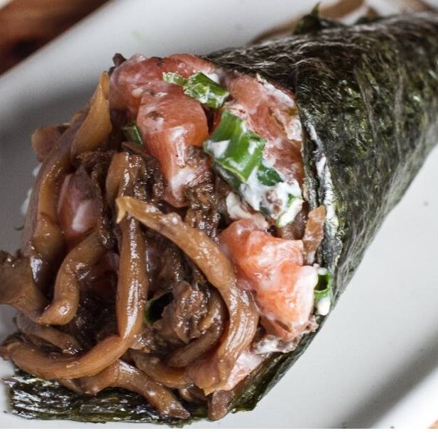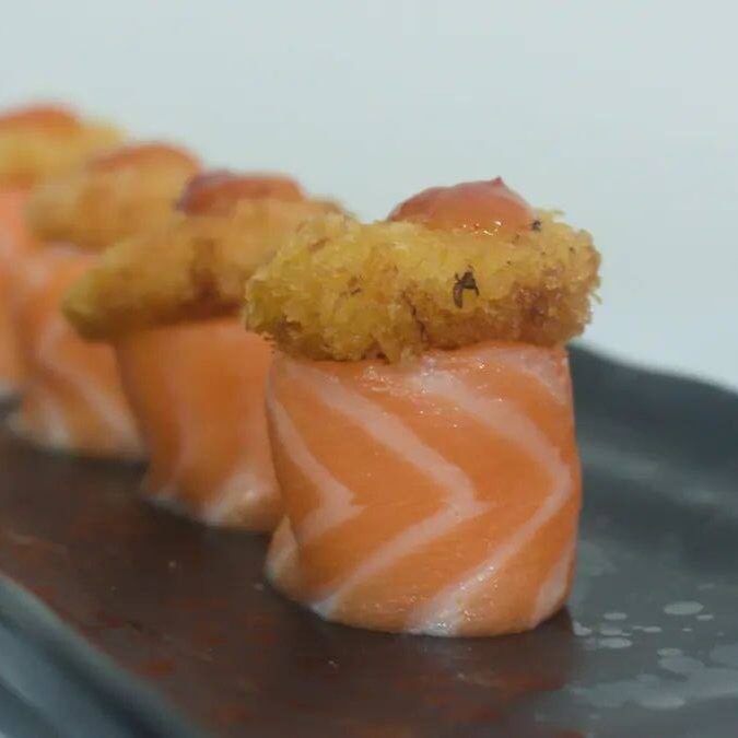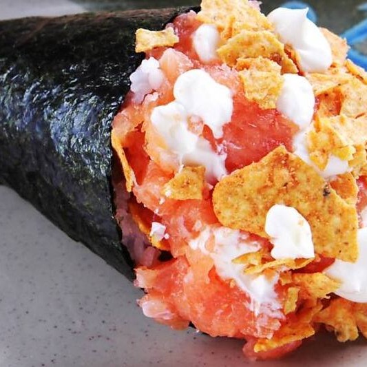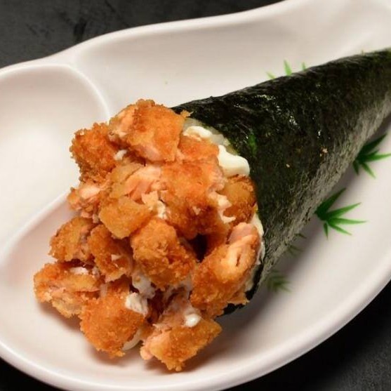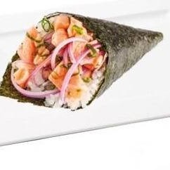 Temaki crocante de salmão grelhado, cream cheese, cebolinha e molho tarê.