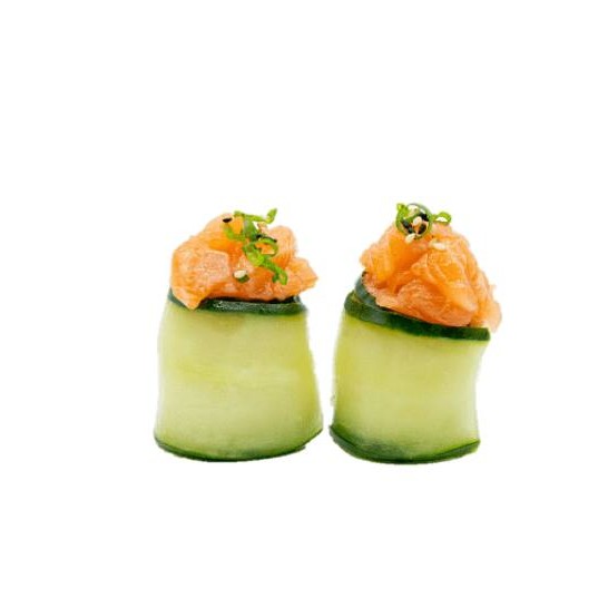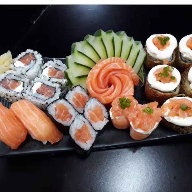 10 Sashimi Salmão, 4 Niguiri Salmão , 4 Niguiri Skin, 4 Joe, 8 Uramaki Salmão, 8 Uramaki Salmão Grelhado, 10 Hot Especial e 2 Gunkan de Pepino.