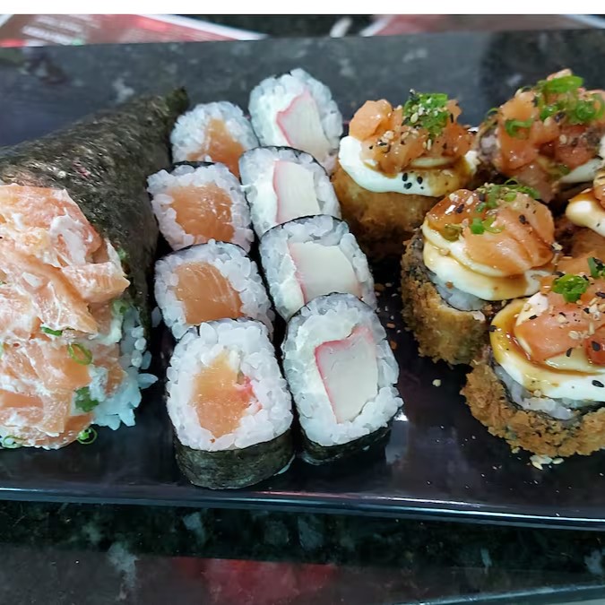 6 Sashimi Salmão , 2 Niguiri Salmão , 2 Joe , 4 Uramaki Salmão , 5 Hot Especial e 4 Sakemaki