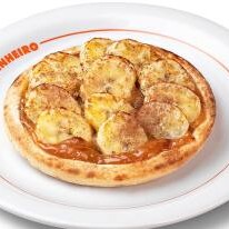 Esfiha aberta de banana, doce de leite coberta com mussarela.