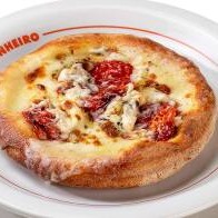 Esfiha de mussarela, fatias de tomate seco coberto com requeijão cremoso e orégano.