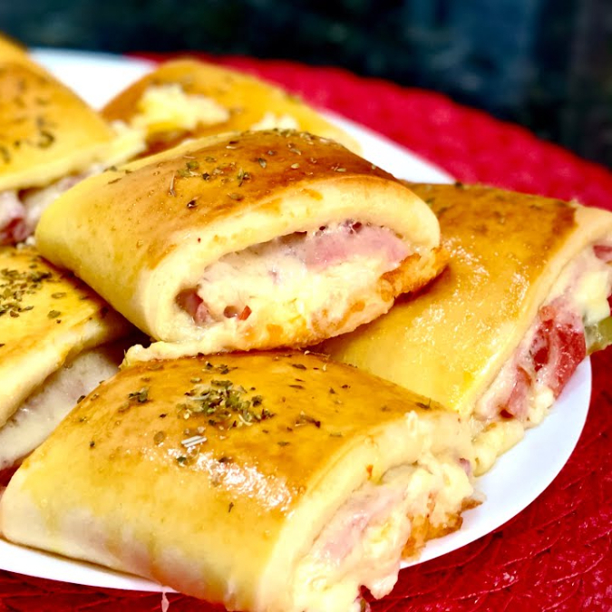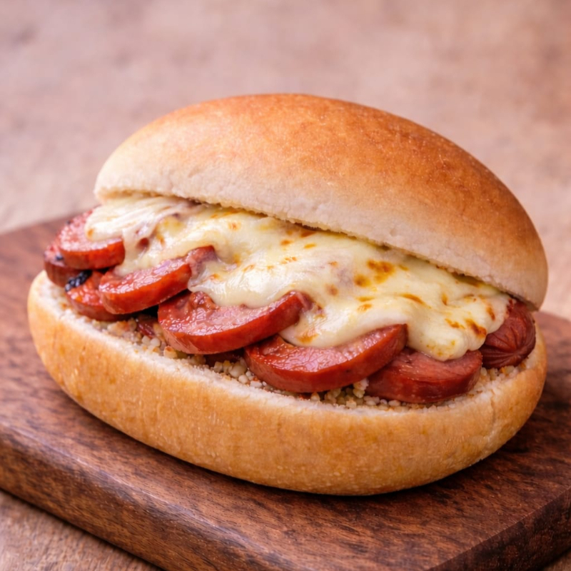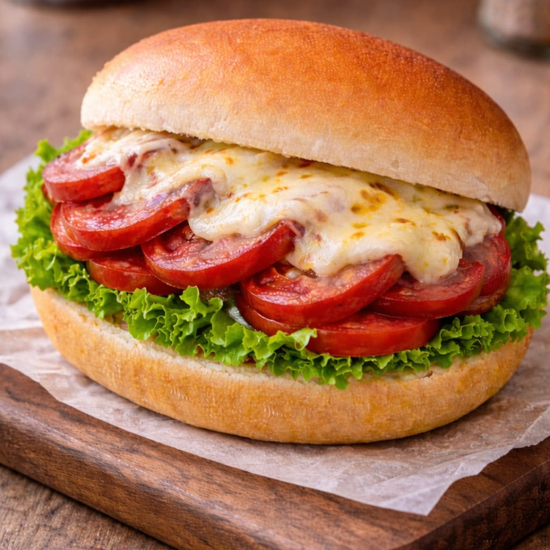 pão de hamburguer, calabresa, mussarela, tomate e alface