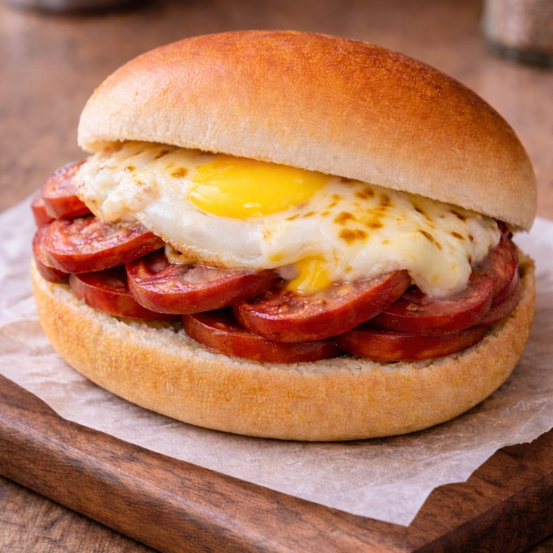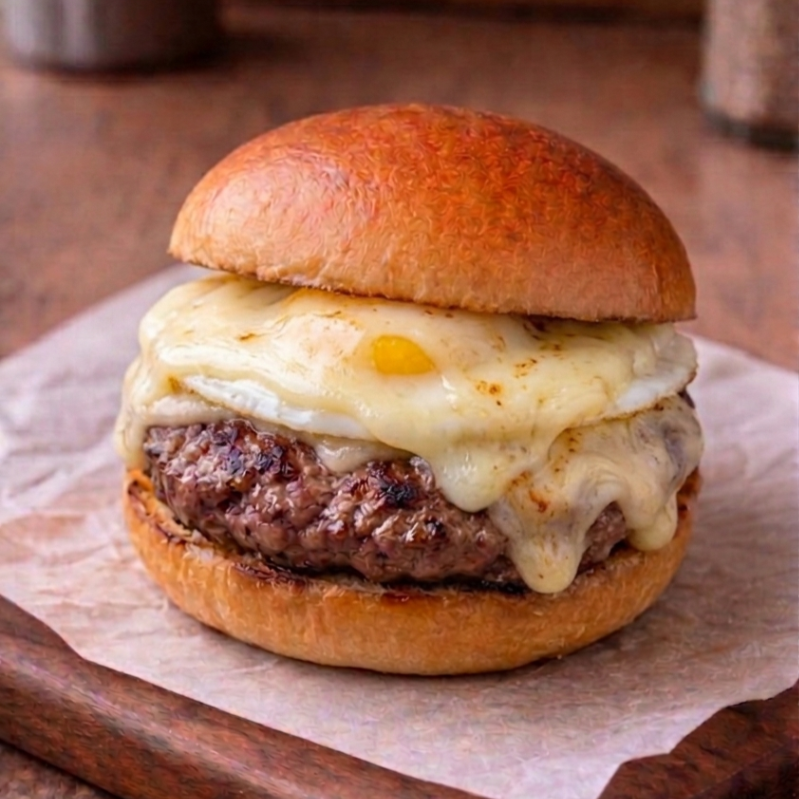 Pão de hambúrguer, mussarela, hambúrguer e ovo