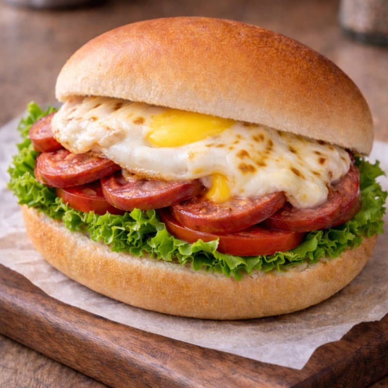 pão hamburguer, calabresa, ovo, mussarela, alface e tomate