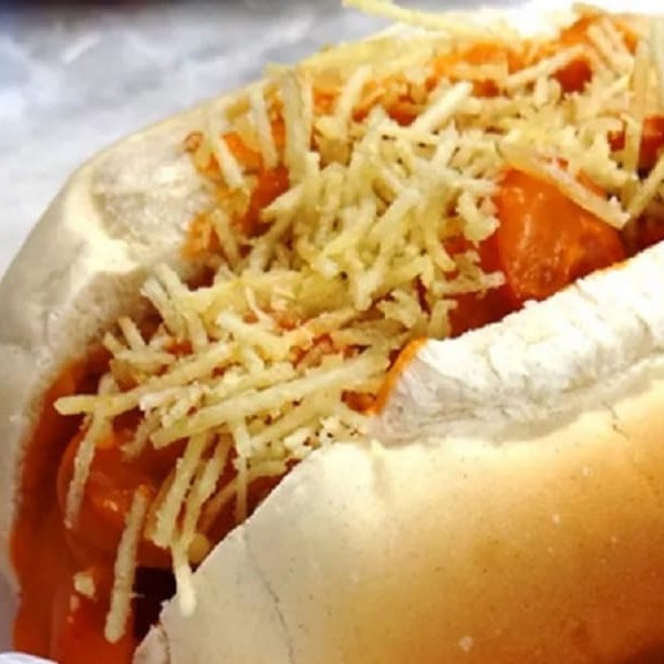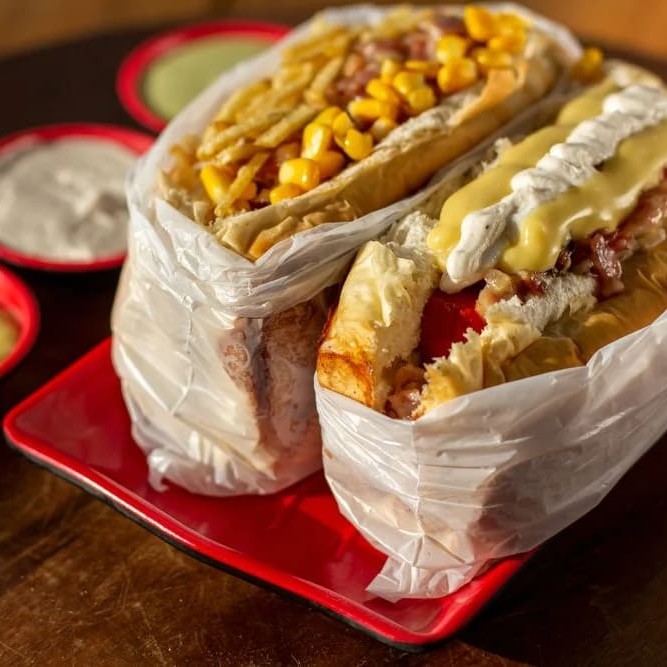 1 salsicha, vinagrete, catchup, mostarda, maionese, requeijão cremos, milho, batata palha e bacon