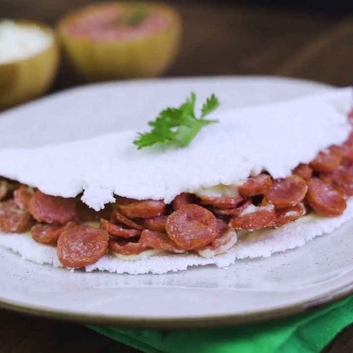 Tapioca calabresa com cebola: picante, saborosa e com um toque especial de cebola caramelizada.