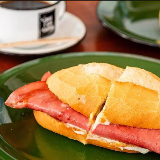 Pão francês com muita mortadela de excelente qualidade + café expresso para acompanhar.