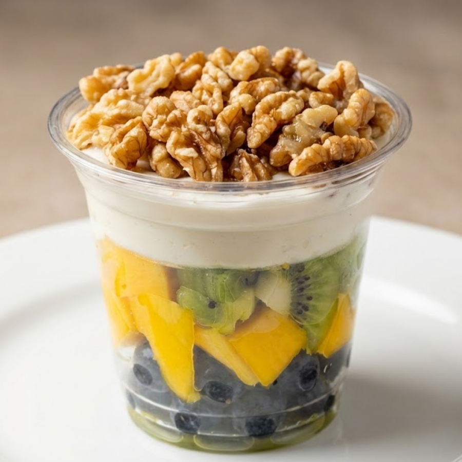 Copo 300 ml com nozes, 3 frutas do dia e iogurte zero, combinação equilibrada de texturas e sabores, preparada com ingredientes selecionados e frescos.