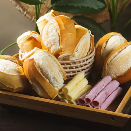 8 pães francês fresquinhos e macios por dentro, acompanhados de 100gr de muçarela e 100gr de presunto.