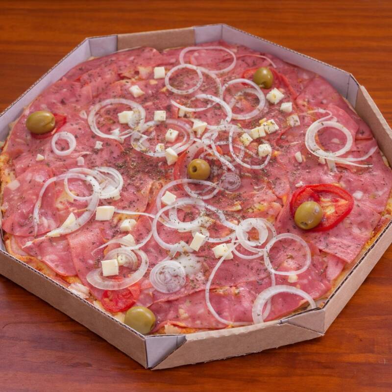 Pizza de massa artesanal, com calabresa, mussarela, presunto, palmito, tomate, cebola e azeitona.