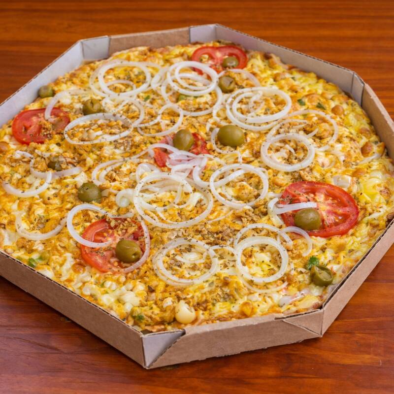 Pizza de massa artesanal, com frango, mussarela, presunto, palmito, tomate, cebola e azeitona.