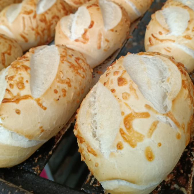 Pão com crosta de requeijão, macio por dentro e crocante por fora.