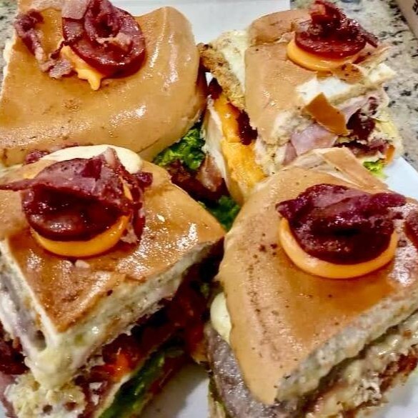 2 Hambúrguer, 2 ovo, bacon, calabresa, cheddar, mussarela, presunto , alface, tomate