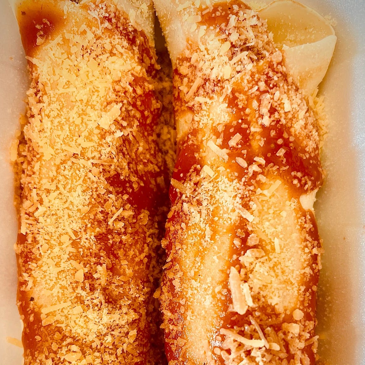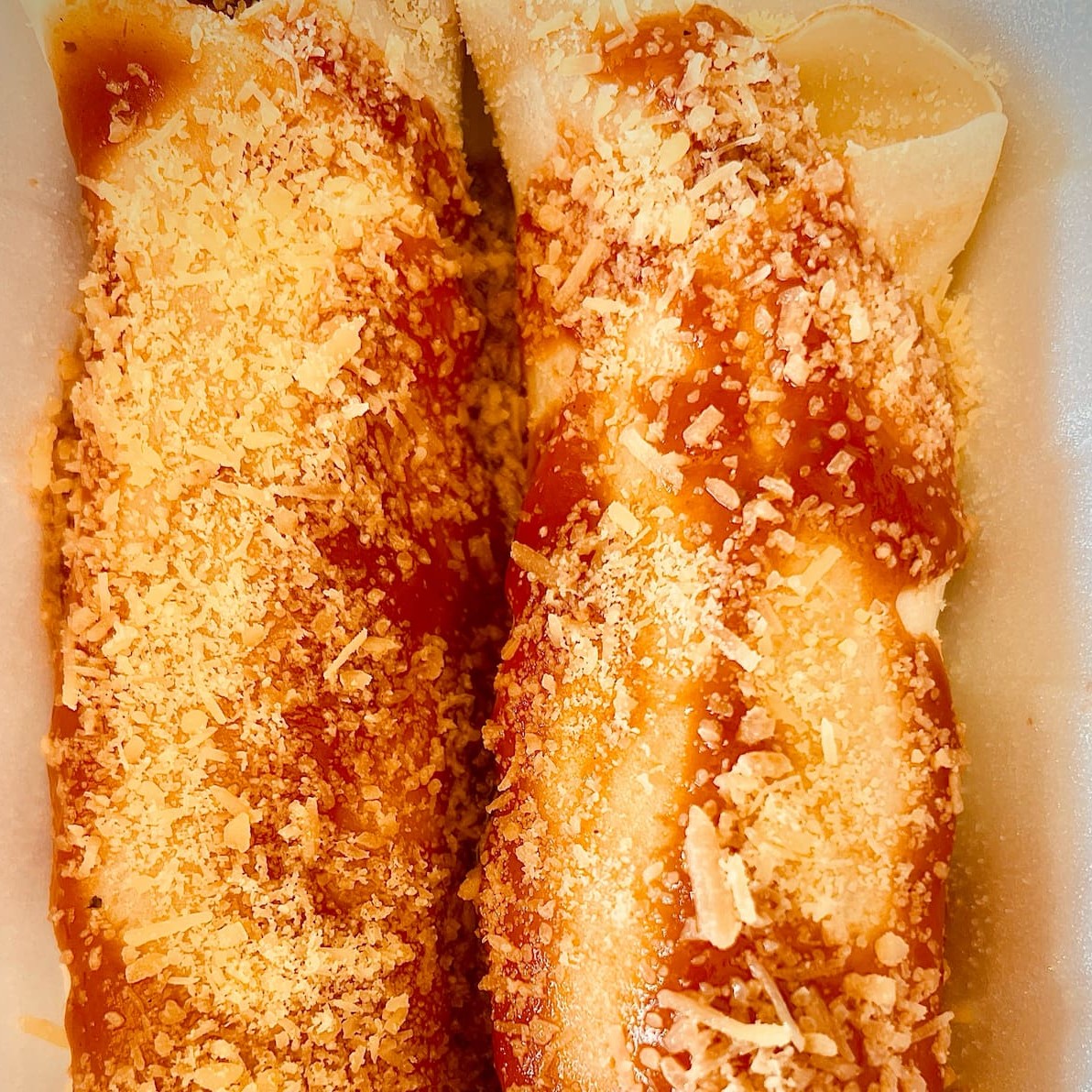 Duas panquecas recheadas com costela desfiada, cobertas com molho vermelho e finalizadas com queijo parmesão. Uma porção irresistível de aproximadamente 400g.