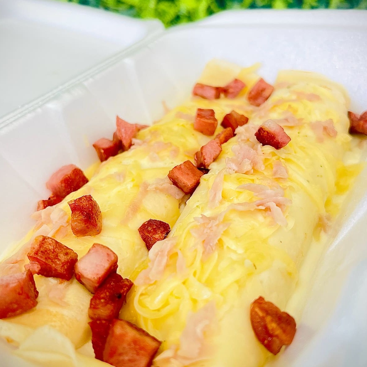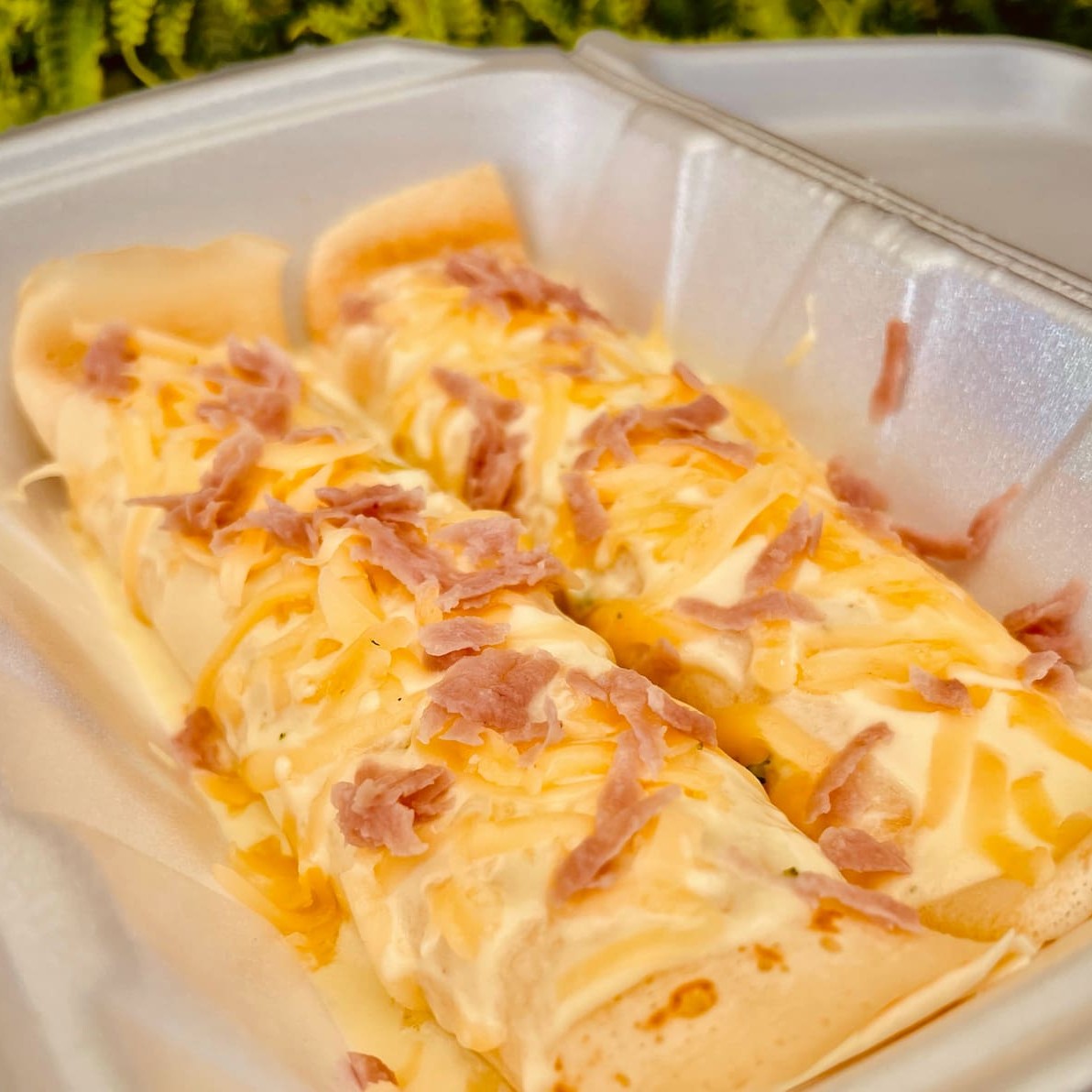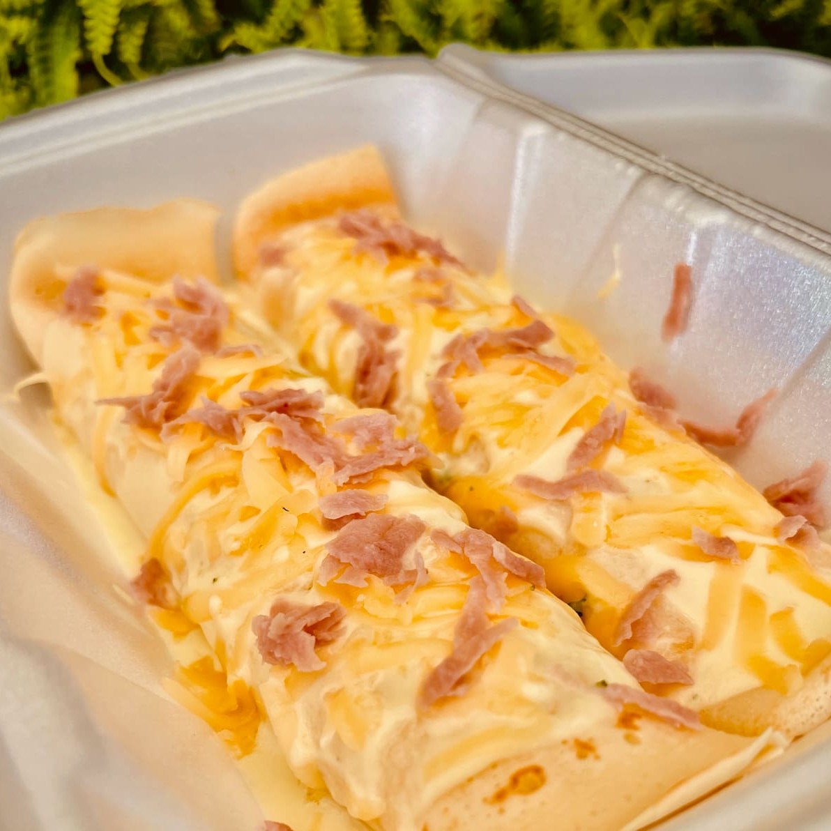 Duas panquecas recheadas, servidas com molho bechamel e um delicioso mix de calabresa, presunto, bacon e tomate seco. Uma porção generosa de aproximadamente 400g.