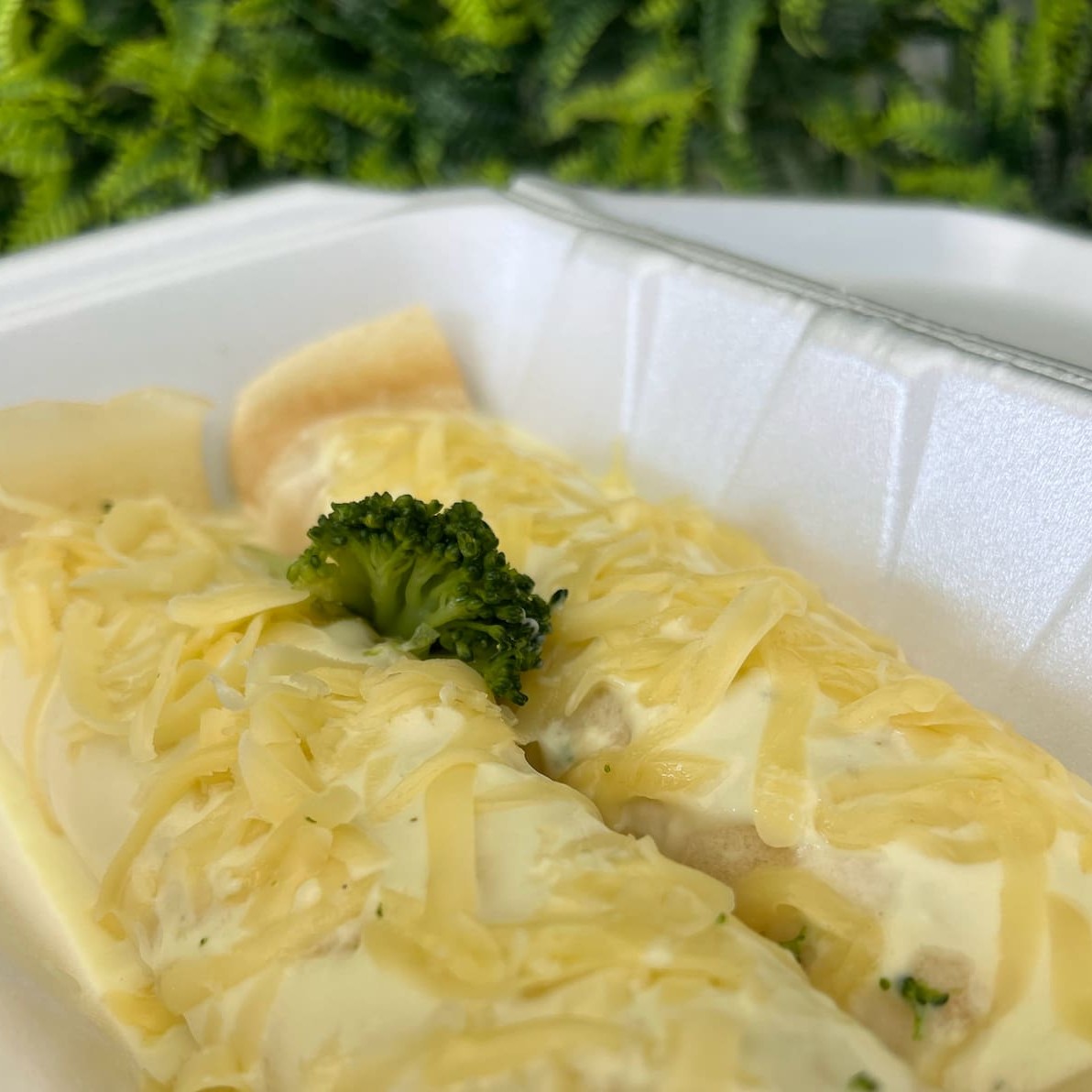 Duas panquecas recheadas com nossa massa especial, cobertas com um cremoso molho bechamel que realça o sabor dos brócolis e finalizadas com queijo mussarela derretido. Uma combinação leve, saborosa e inesquecível! Porção individual com aproximadamente 400g. Não perca a chance de experimentar!
