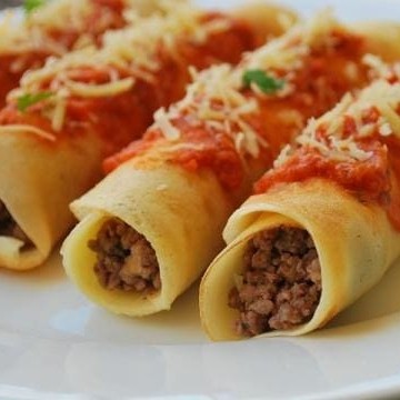Acompanhada de uma unidade de Panqueca ! Panqueca recheada com nossa deliciosa massa artesanal, cobertas com molho vermelho e nosso saborosa carne à bolonhesa, finalizadas com queijo parmesão. Uma explosão de sabor em cada mordida! Porção individual com aproximadamente 250g. Não perca a chance de experimentar! * imagem meramente ilustrativa