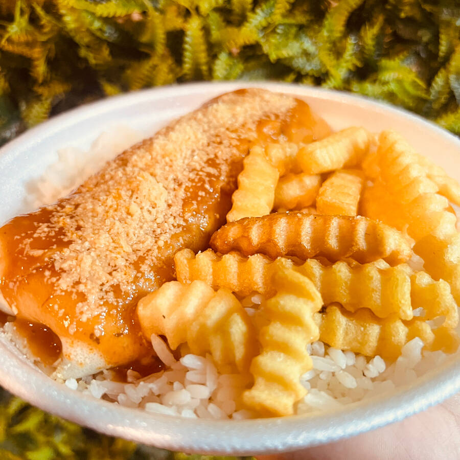 Nossa deliciosa panqueca a bolonhesa com arroz e fritas