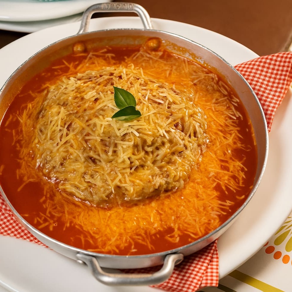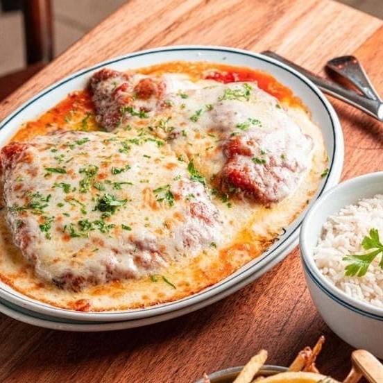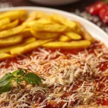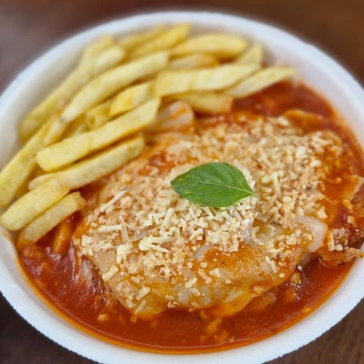 Acompanha arroz e batata frita. Filé mignon empanado, coberto com molho de tomate feito em nossa casa e queijo musarela e parmesão. Marmita, Batata frita, Promoção, Entrega Rápida, Entrega Grátis. Parmegiana campone