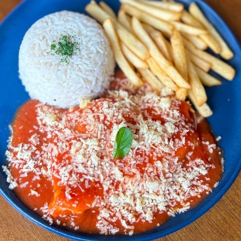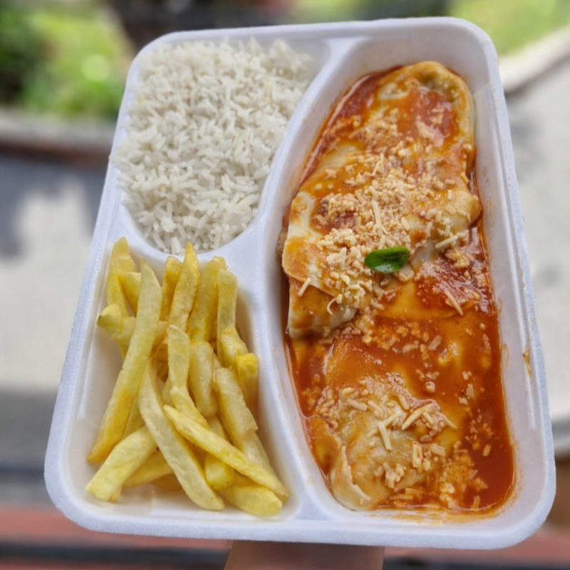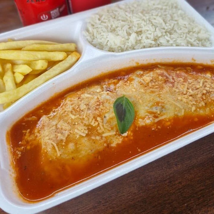 Acompanha arroz, salada e batata frita. Frango empanado, coberto com molho de tomate feito em nossa casa e queijo musarela. Marmita, Batata frita, Promoção, Entrega Rápida, Entrega Grátis. Parmegiana campone