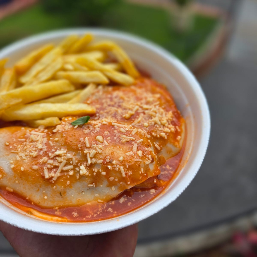 Acompanha arroz e batata frita. Frango empanado, coberto com molho de tomate feito em nossa casa e queijo musarela e parmesão. Marmita, Batata frita, Promoção, Entrega Rápida, Entrega Grátis. Parmegiana campone