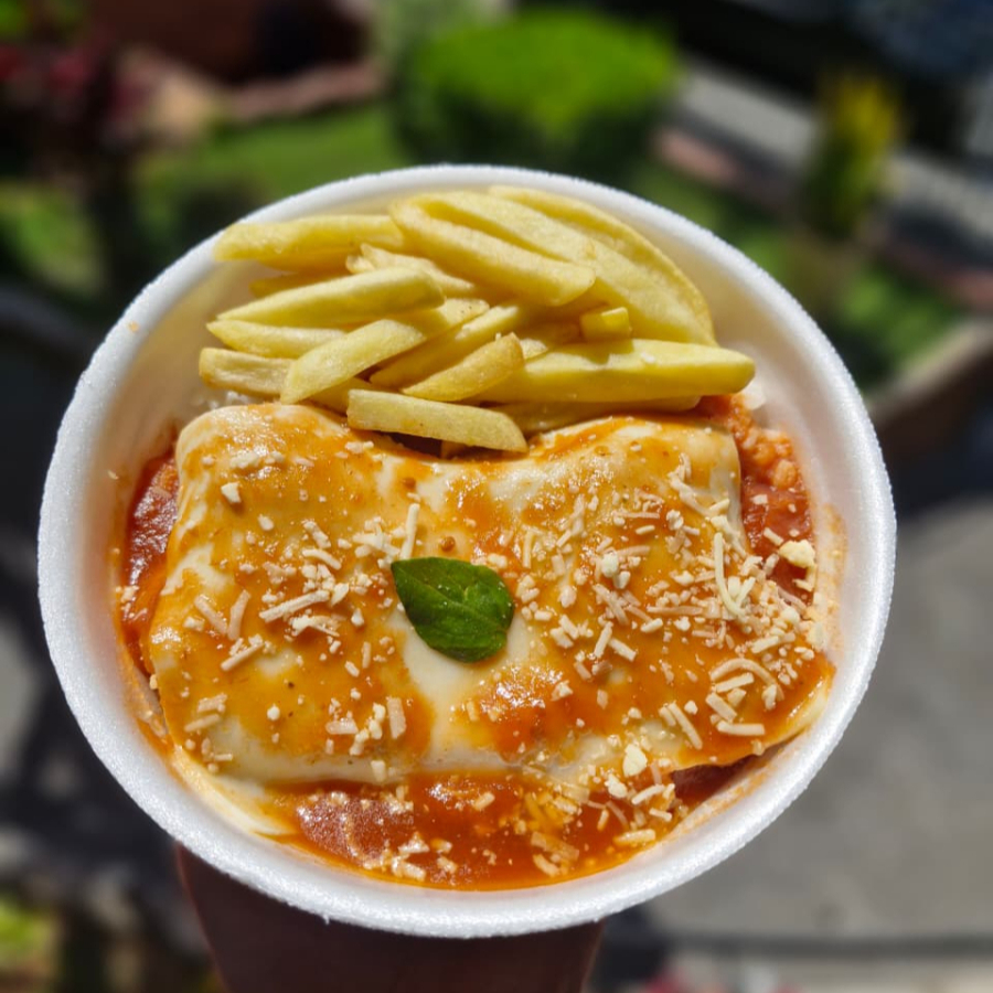 Acompanha arroz, salada e batata frita. Filé mignon empanado, coberto com molho de tomate feito em nossa casa e queijo musarela. Marmita, Batata frita, Promoção, Entrega Rápida, Entrega Grátis. Parmegiana campone