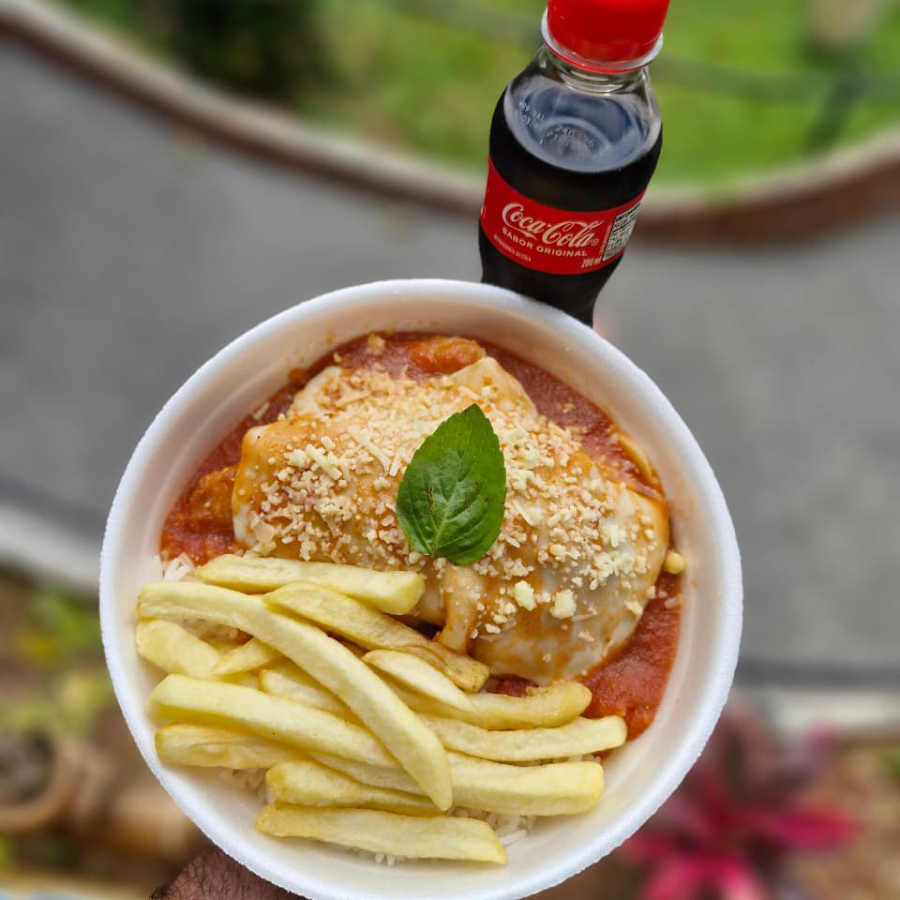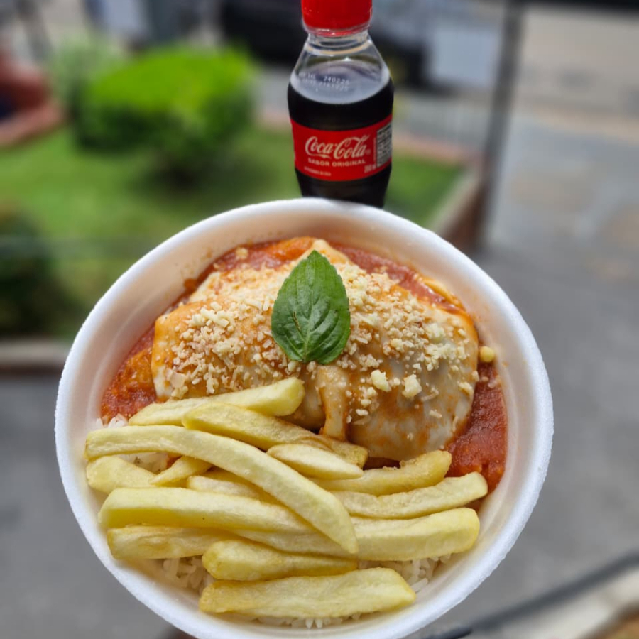 Acompanha arroz e batata frita + coca cola. Frango empanado, coberto com molho de tomate feito em nossa casa e queijo musarela. Marmita, Batata frita, Promoção, Entrega Rápida, Entrega Grátis. Parmegiana campone