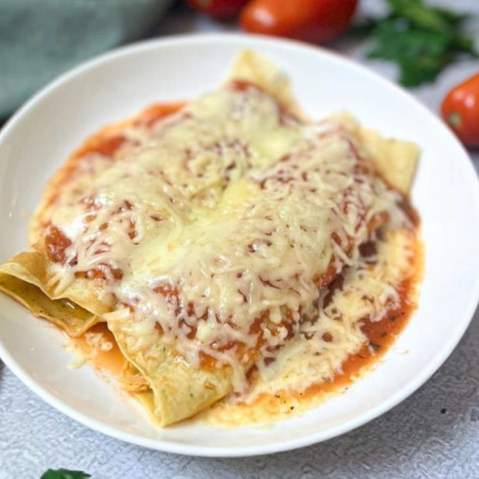 Panqueca de Frango — porção individual ️ Massa leve e macia recheada com frango desfiado e bem temperado, coberta com nosso delicioso molho caseiro e finalizada com uma generosa camada de queijo mussarela derretido. Acompanha arroz soltinho e fritas douradas e crocantes, criando uma refeição completa e irresistível.