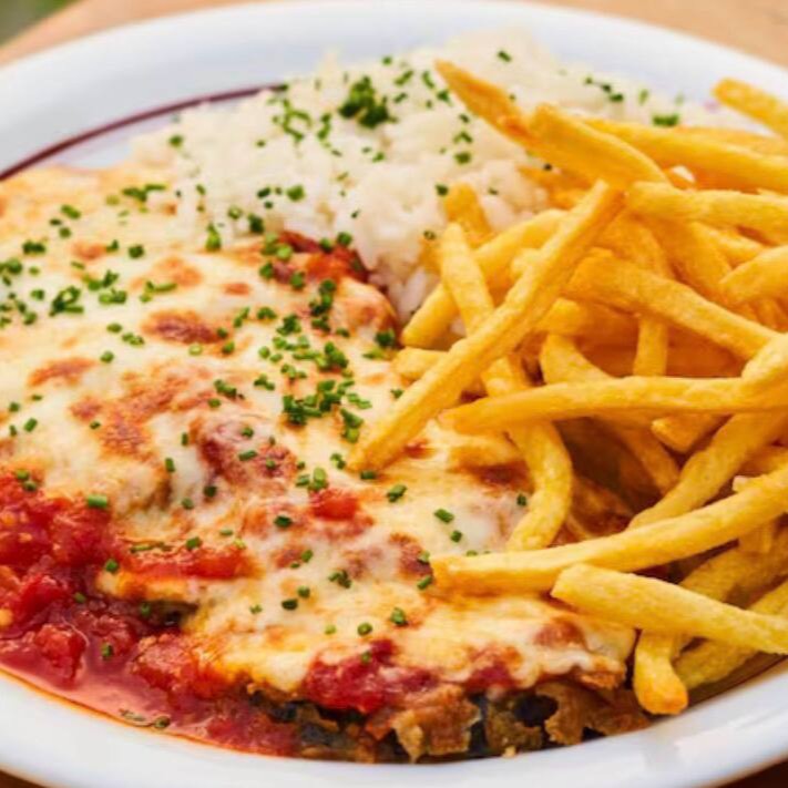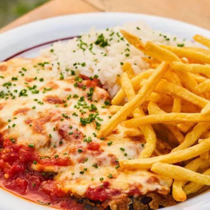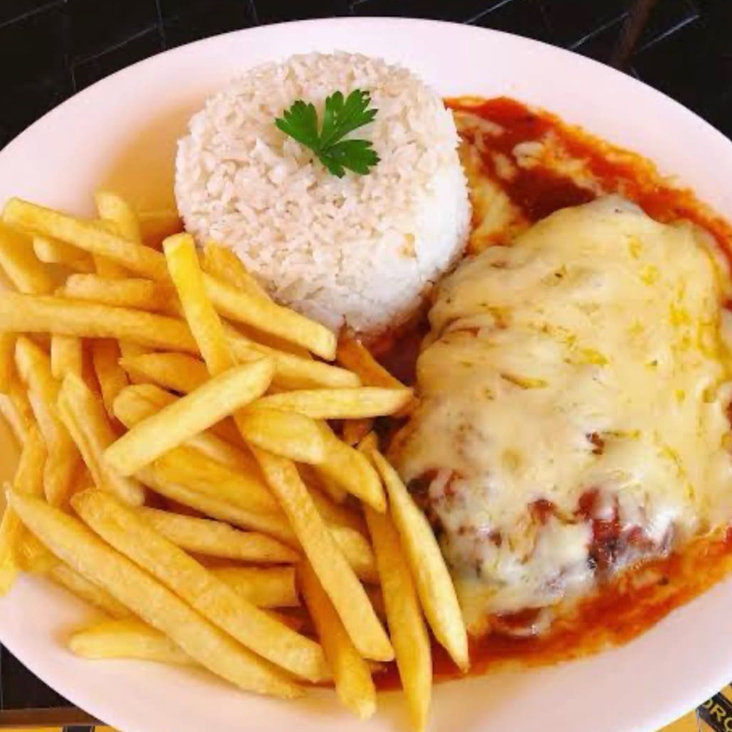 Parmegiana de Carne. Suculento bife empanado, no ponto certo, coberto com um molho de tomate encorpado e finalizado com queijo derretido, gratinado até ficar irresistível. Acompanha arroz soltinho e batatas fritas crocantes.