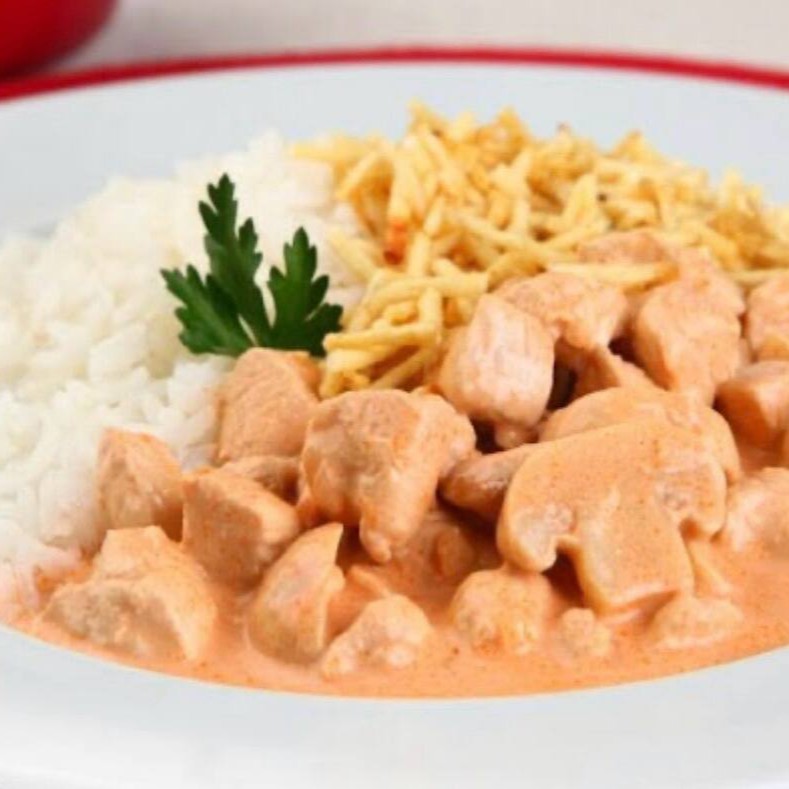 Combo com 2 Marmitas de Strogonoff de Frango ️ Duas porções de strogonoff de frango cremoso, preparado com pedaços macios e bem temperados, envoltos em um molho rico e saboroso. Acompanhadas de arroz soltinho e fritas douradas e crocantes, formando uma refeição completa, farta e irresistível — perfeita para compartilhar ou aproveitar sem pressa. + 1 refrigerante de 350ml