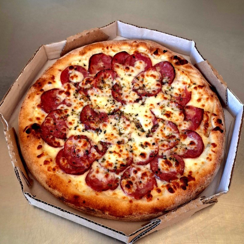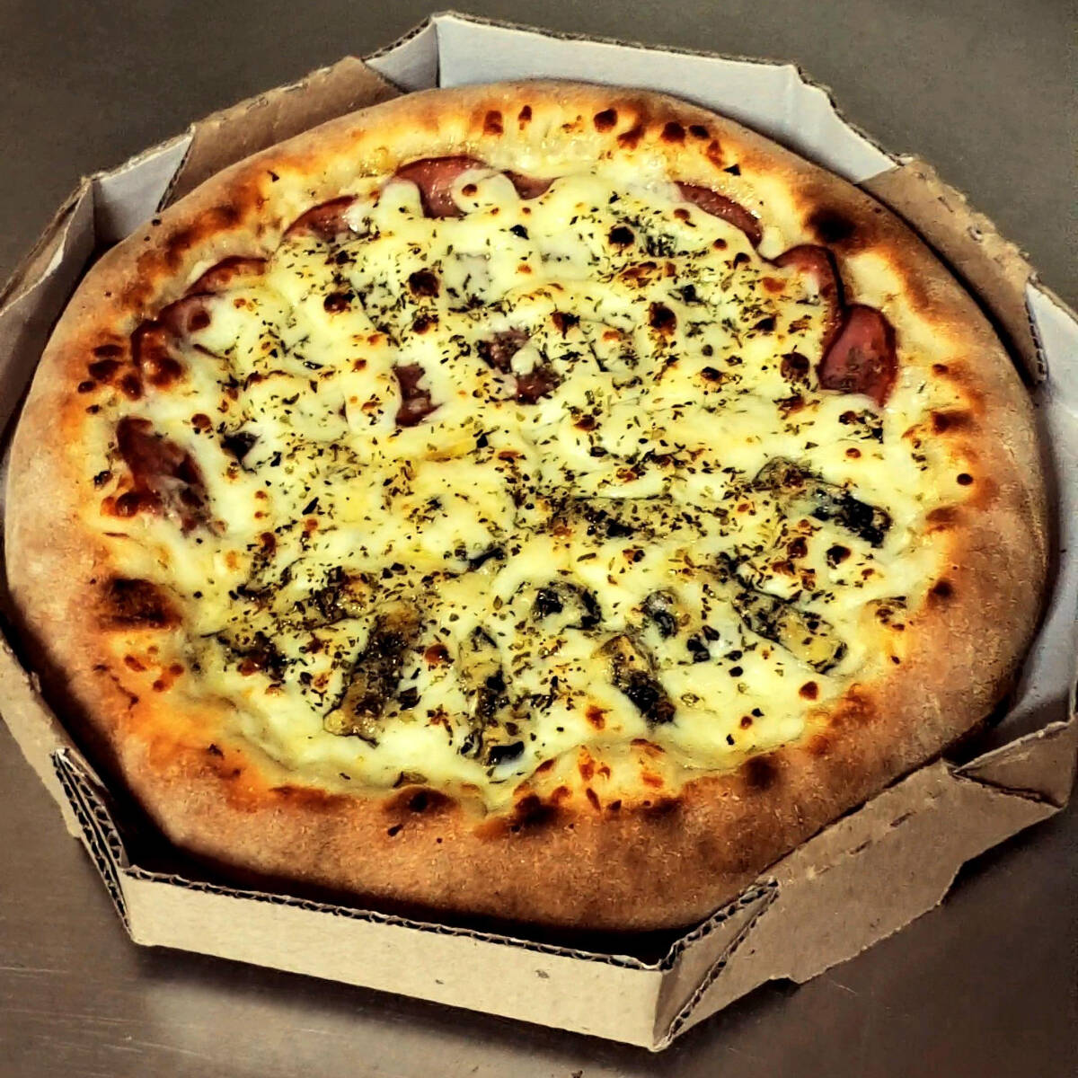 Pizza montada e assada na hora! Leva Mussarela, Calabresa fatiada e Orégano. (BORDA SEM RECHEIO / TRADICIONAL) // Peso: +/- 400g
