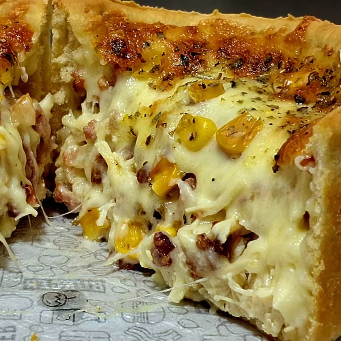 Esta pizza estufada no estilo Deep Dish é feita com uma massa artesanal fina e leve, de lenta fermentação. Abrasileirada nos sabores, seu grande destaque é o abundante recheio (300g em média), totalizando uma deliciosidade quente e cremosa de 400 gramas. Uma verdadeira festa de sabores!