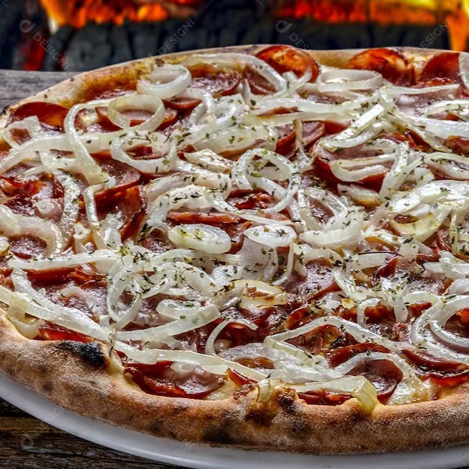 Pizzas 8 pedaços, sabor único, recheada com delicioso molho especial da casa, calabresa, cebola e uma pitada de orégano