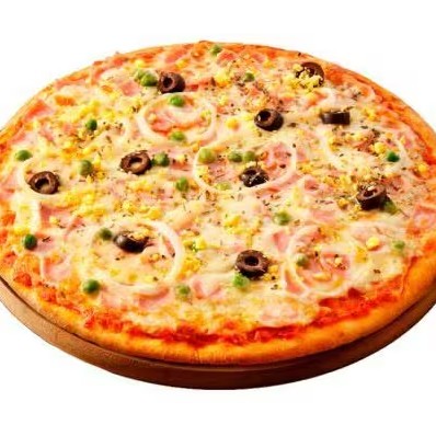 Pizzas 8 pedaços, sabor único, recheada com delicioso molho especial da casa, presunto, milho, ervilha, mussarela, cebola e uma pitada de orégano