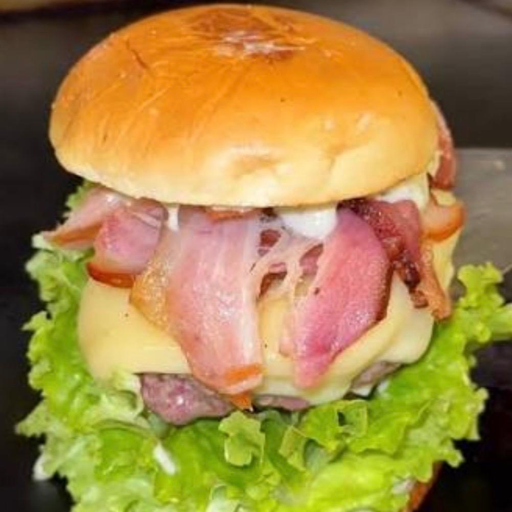 Pão de hambúrguer, carne artesanal, mussarela empanada, bacon e maionese da casa.