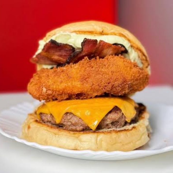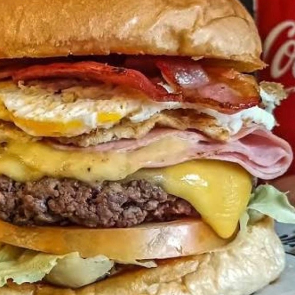 Pão de hambúrguer, carne artesanal, cheddar, bacon, mussarela empanada e anéis de cebola fritos, tomate, alface e molho da casa