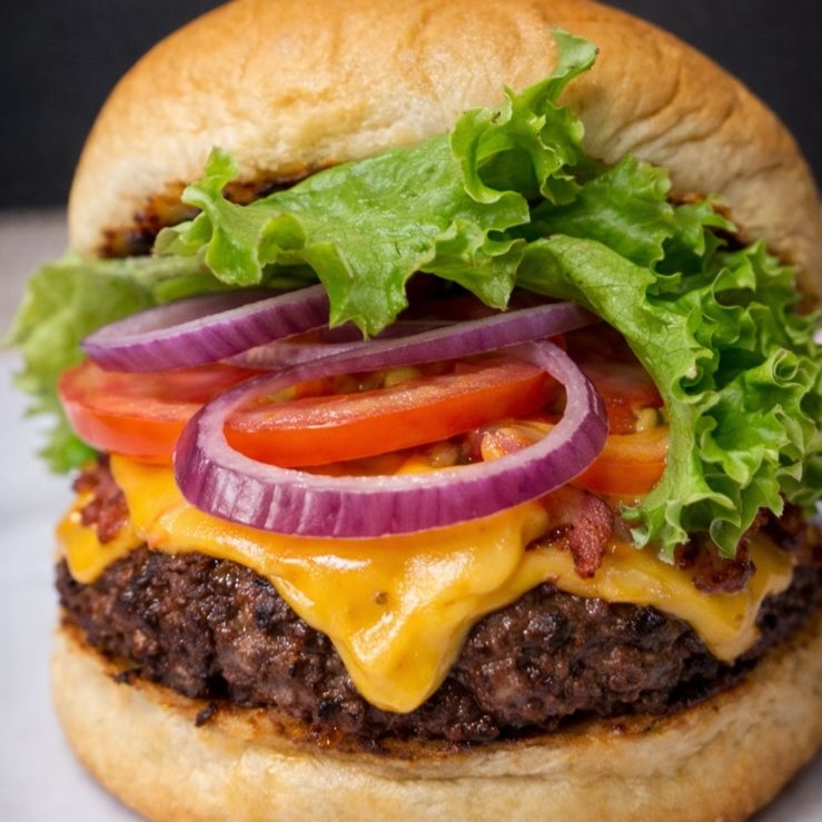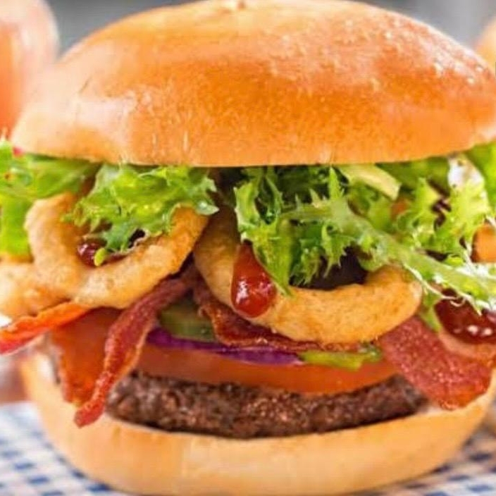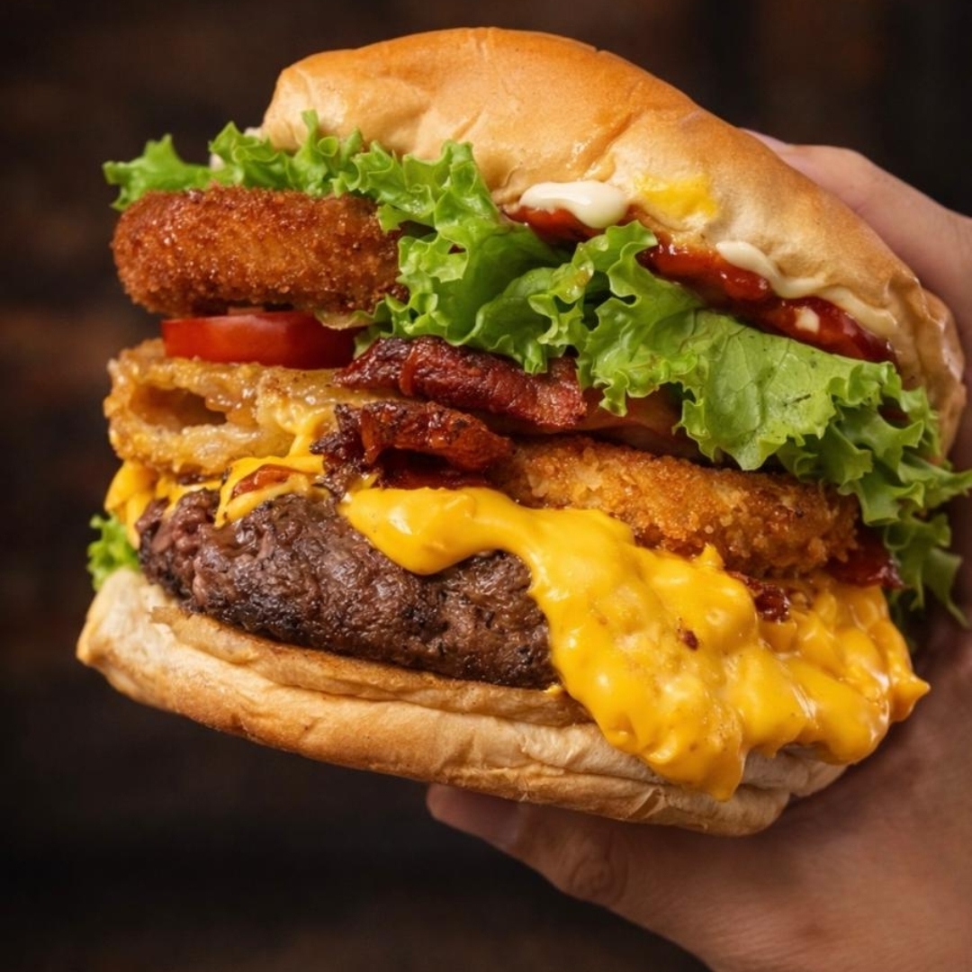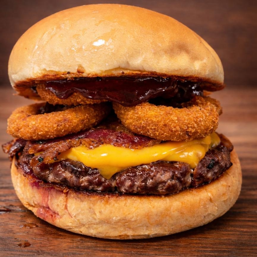 Pão de hambúrguer, carne artesanal, queijo cheddar, bacon crocante e anéis de cebola empanados.