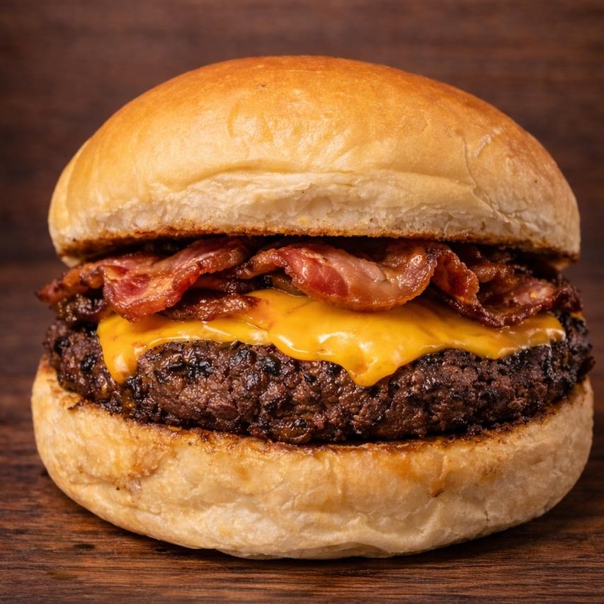 Pão de hambúrguer, carne artesanal, queijo cheddar, bacon crocante e molho barbecue.