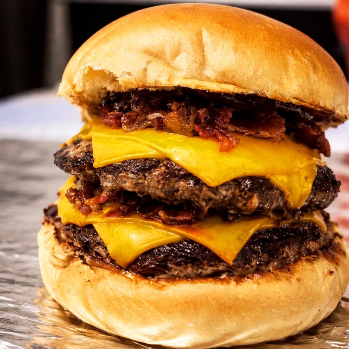 Pão de hambúrguer, 2x carne artesanal, 2x cheddar, bacon crocante e molho barbecue.