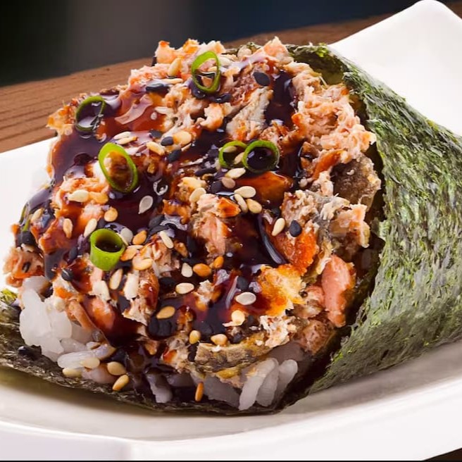 Delicioso Temaki de Salmão Grelhado com Doritos. (Arroz Japonês, Alga (nori), Salmão grelhado com cream cheese e Doritos)