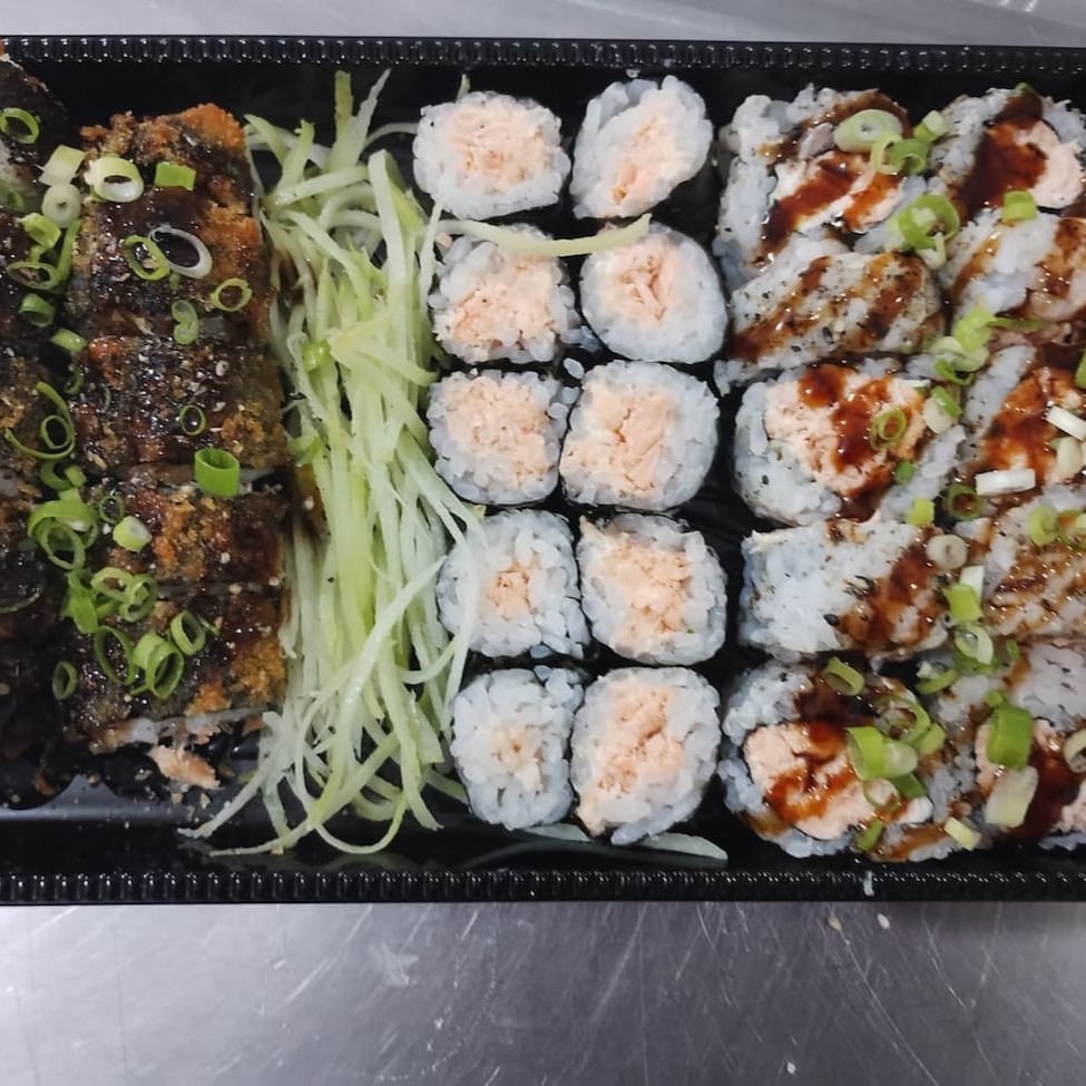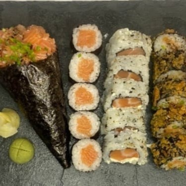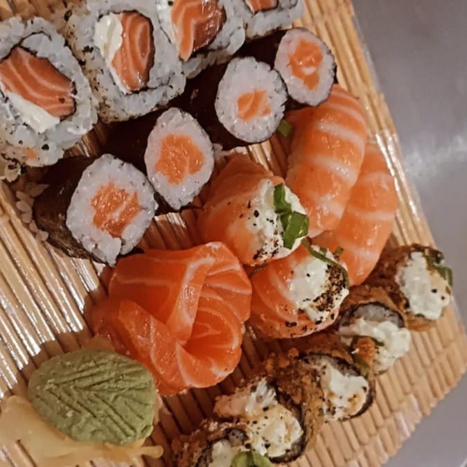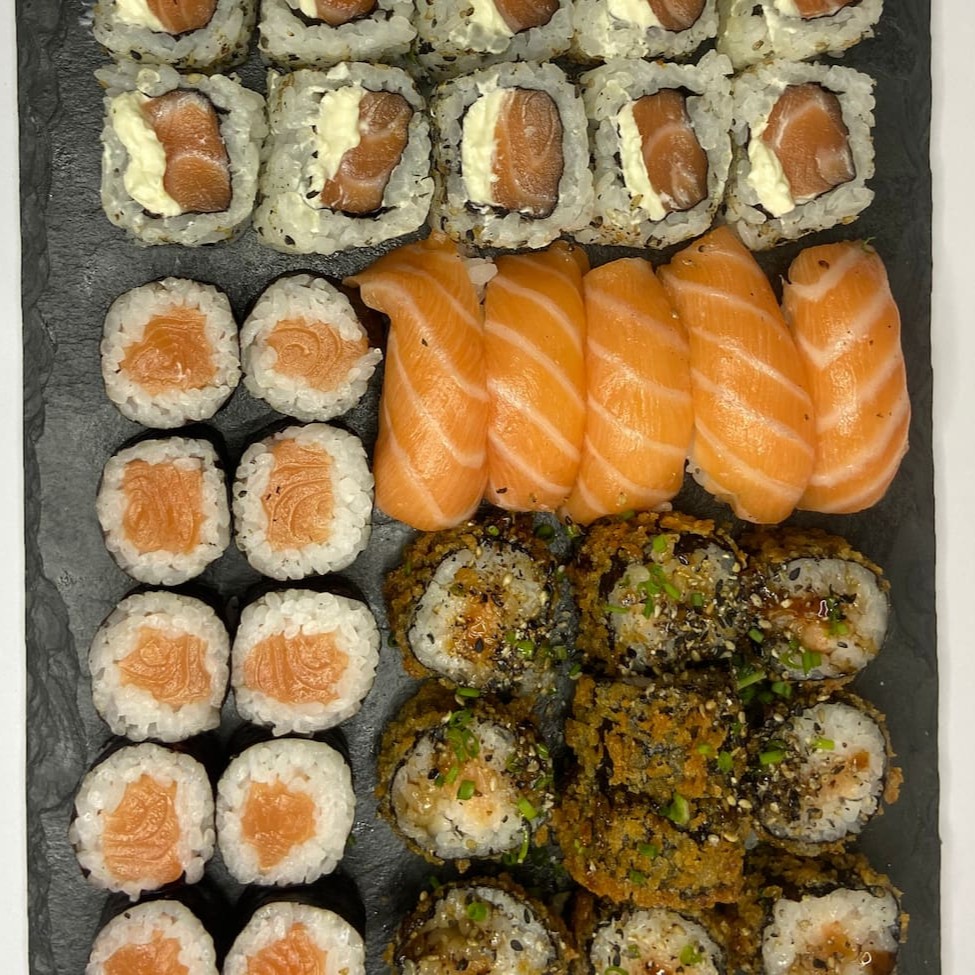 Combo com 35 unidades de sushi. 10 Hot Rolls 10 Uramaki com Salmão e Cream Cheese 10 Hossomaki de Salmão 5 Niguiris de Salmão Perfeito!