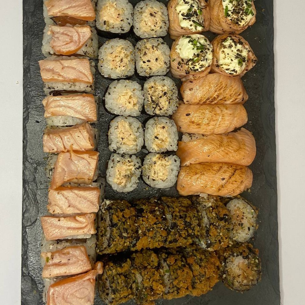 Delicioso combinado com 38 peças de sushis! 10 Uramaki com Salmão Empanado dentro e Maçariado por cima 10 Hot Rolls de Salmão Com Cream Cheese 10 Hossomaki com Recheio de Salmão Grelhado 4 Niguiris com salmão Maçaricado 4 Jyo de Salmão Coberto com um delicioso Cream Cheese Maçaricado. Nesse prato, não vai nenhum item cru. Tudo grelhado e maçaricado!