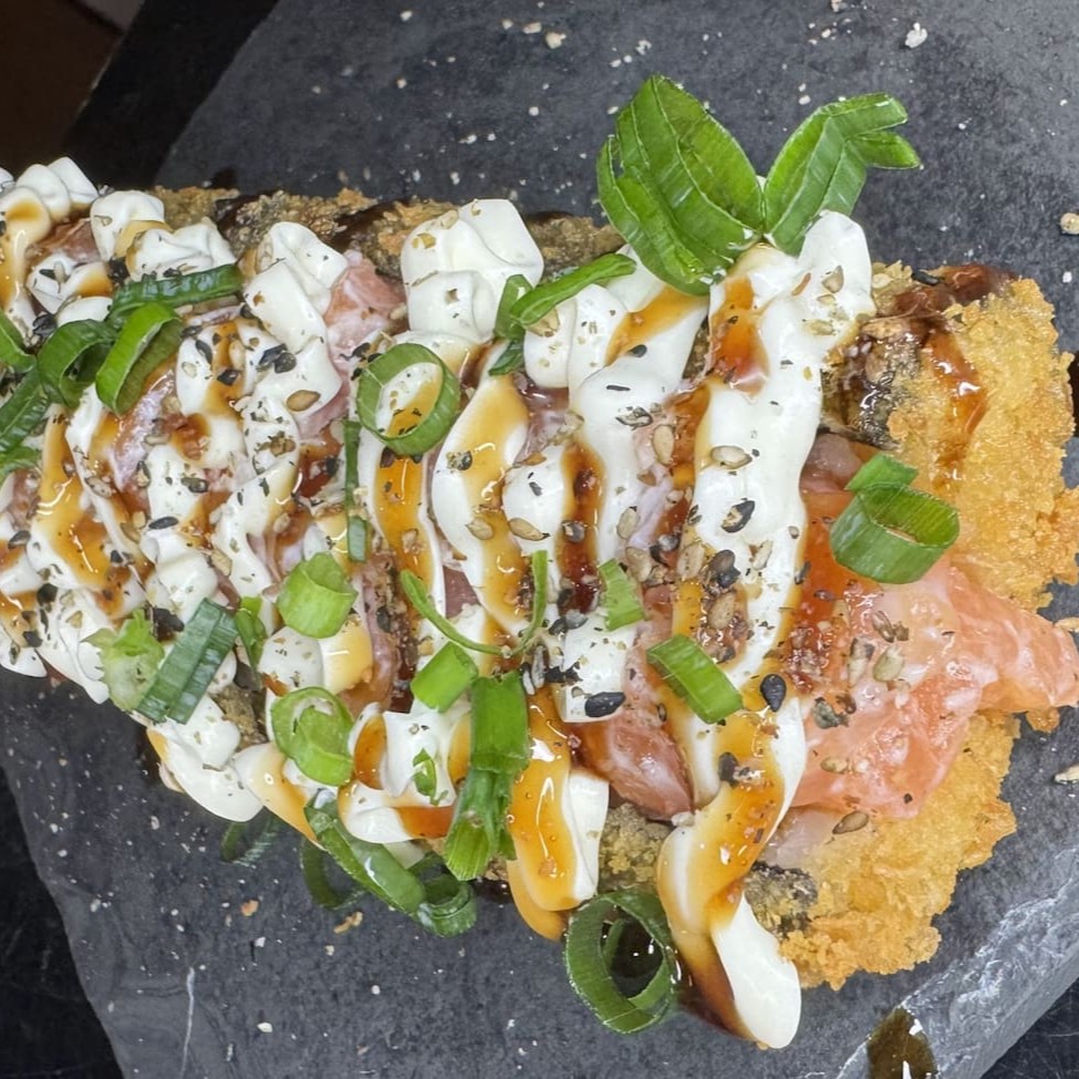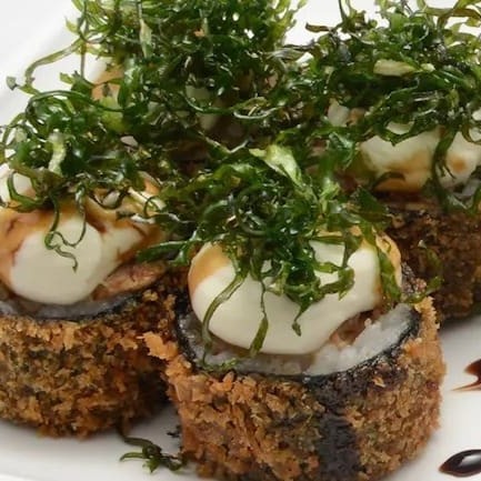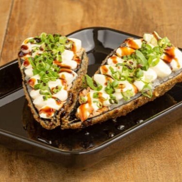 10 Unidades de Hot Rolls de salmão, coberto com Cream Cheese, Couve Crispy, tarê, cebolinha e gergelim. *Acompanha hashi, molho shoyu e tarê (Quantidade proporcional aos produtos adquiridos).